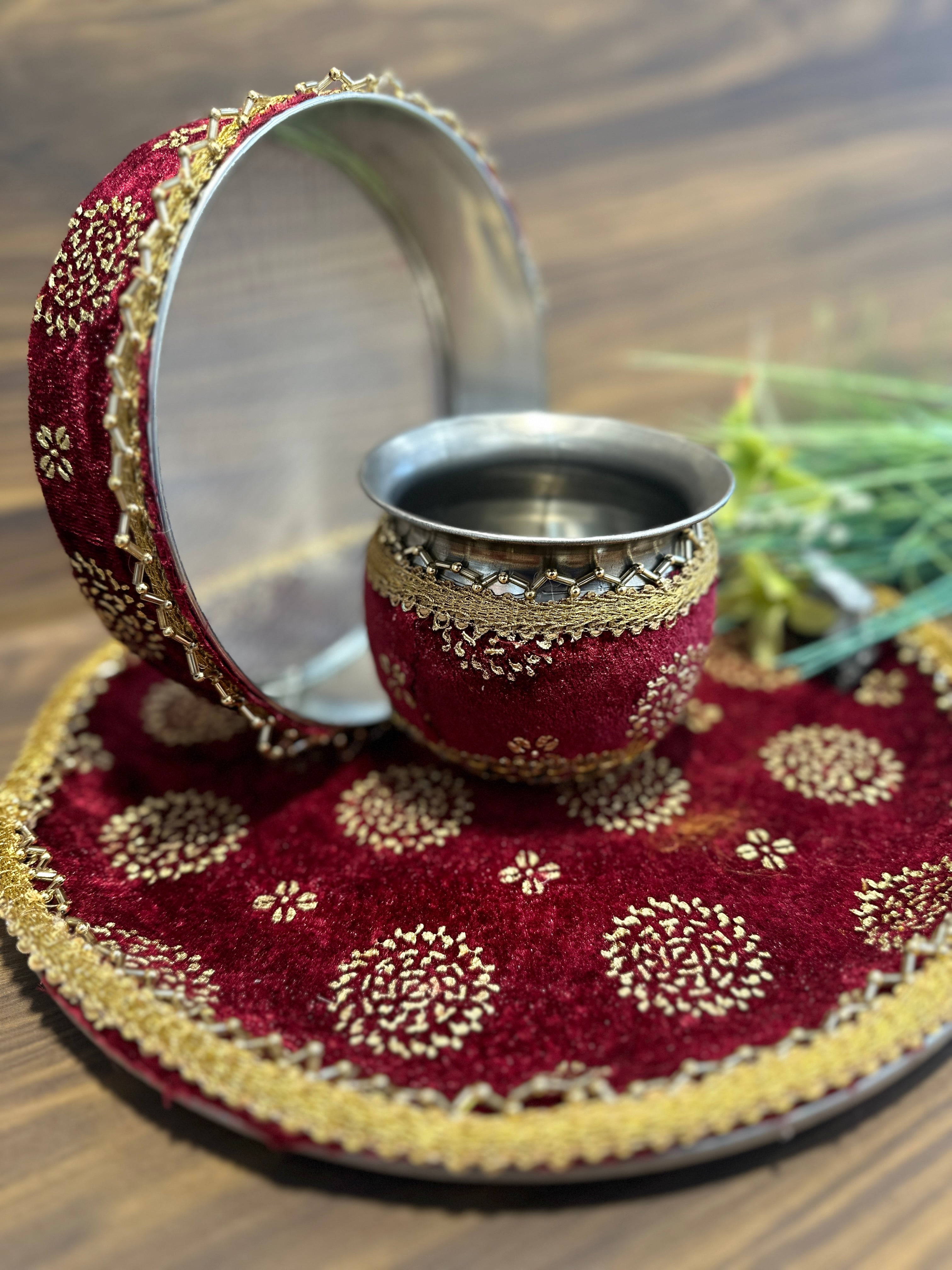 Enjoy the traditional ritual of Karwa Chauth by bringing home this beautifully decorated Thali set. This elegant set will add charm to your special day during the festive season. Bring shine to your auspicious day, celebrate Karwa Chauth with more colours in your life, and add sparkles to your joys.