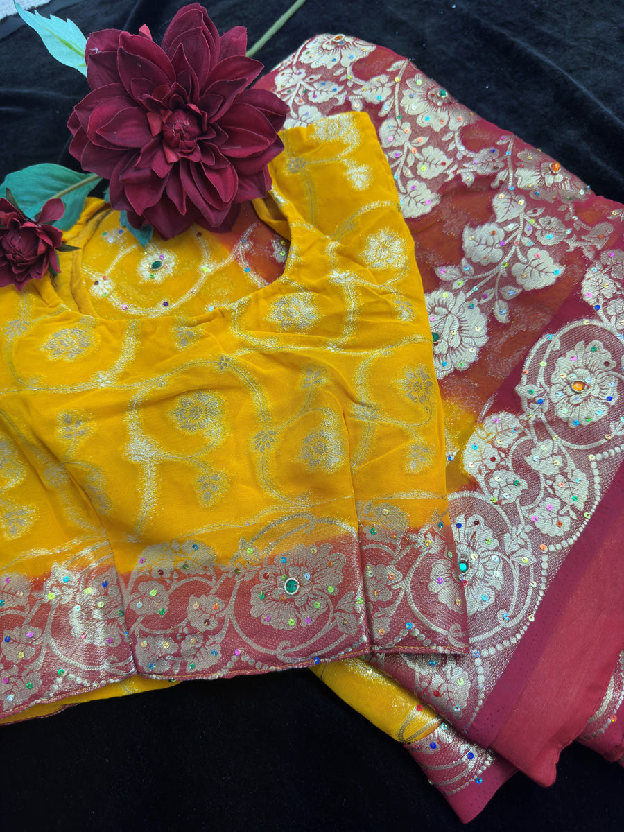 Immerse yourself in the vibrant charm of our Yellow Bandhani Chiffon Saree, accompanied by a meticulously Stitched Blouse, a delightful ensemble that captures the essence of traditional artistry. Crafted from lightweight chiffon, the saree drapes gracefully, providing an ethereal and fluid silhouette that is perfect for festive occasions.