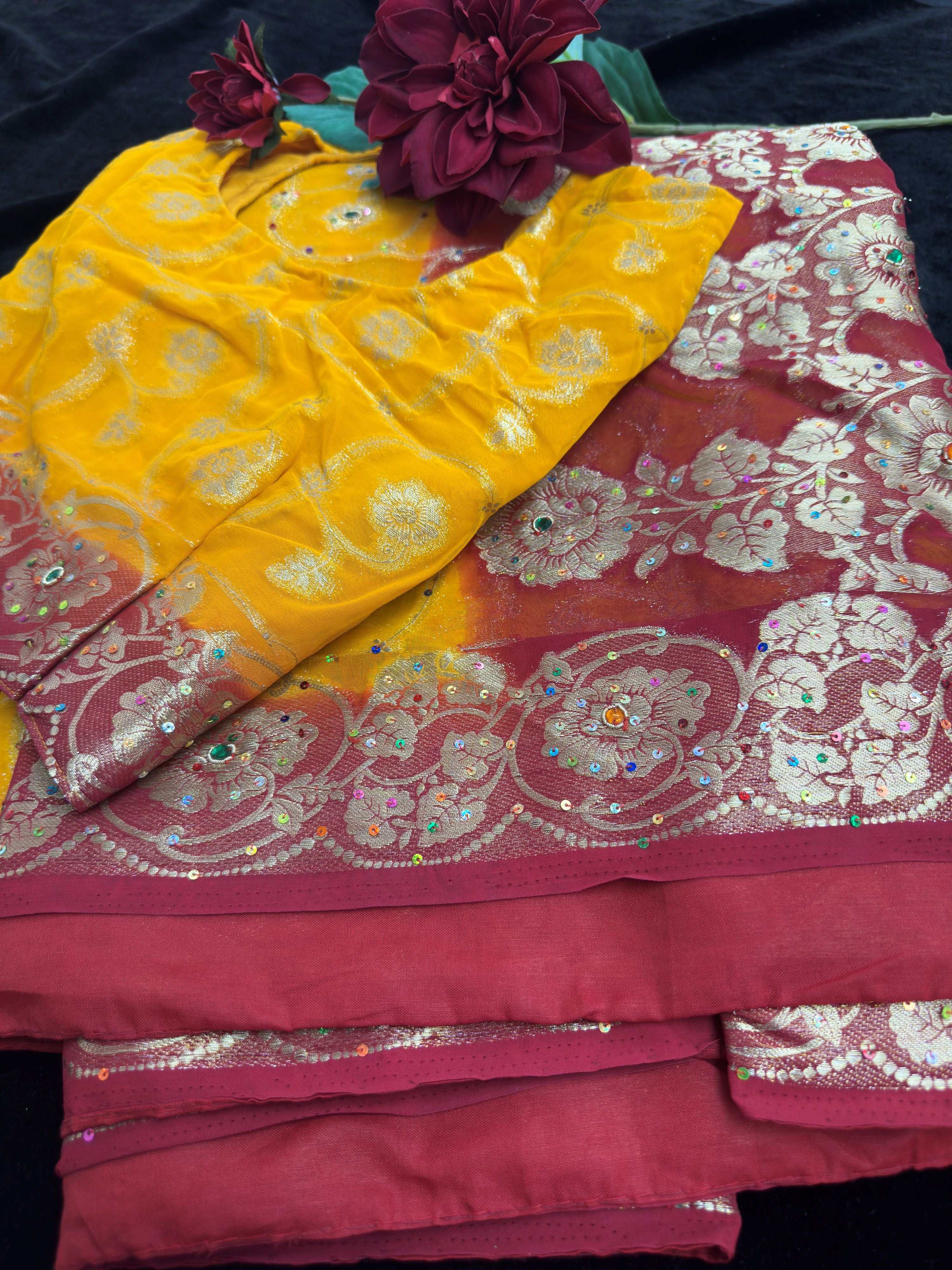 The yellow hue, adorned with classic Bandhani patterns, adds a burst of joy and elegance to this ensemble. Bandhani, a traditional tie-dye technique, creates intricate and eye-catching patterns, making each piece a unique work of art. The playful yet sophisticated design makes this saree an ideal choice for celebratory events, weddings, or cultural gatherings.
